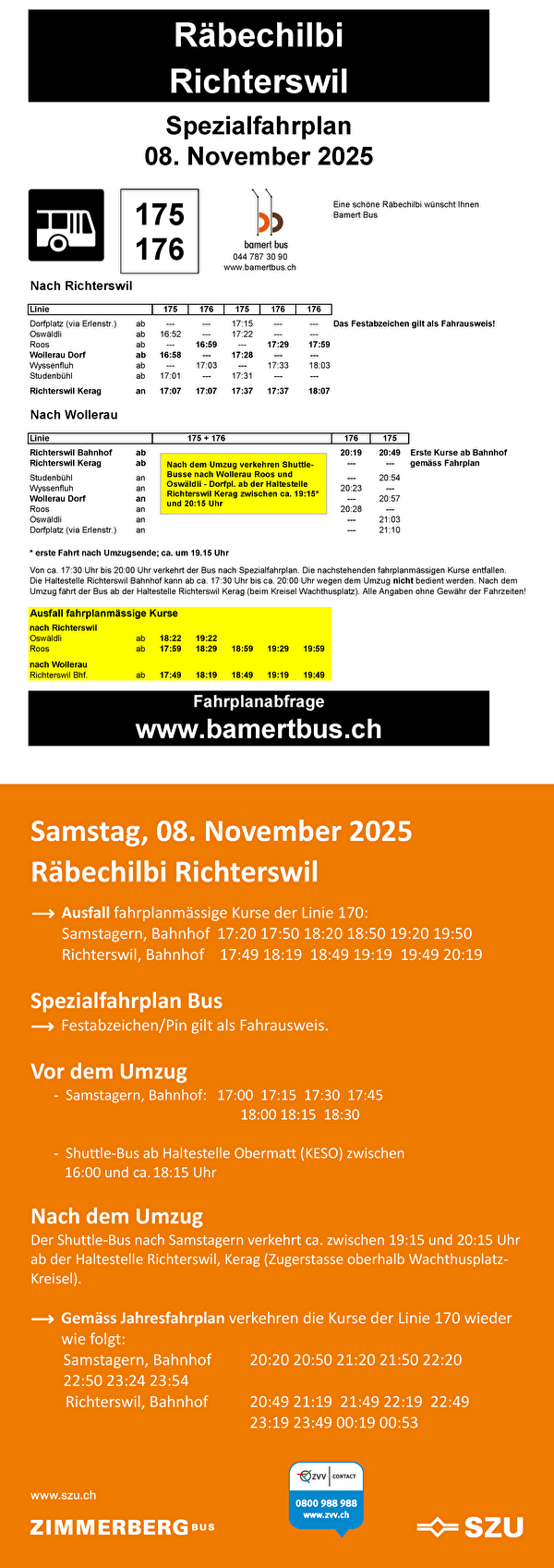 Am Samstag, 08.11.2025 findet in Richterswil die Räbechilbi statt. Der Betrieb der Linien 170, 175 und 176 wird dadurch beeinträchtigt, einige Fahrten fallen aus. Von und zur Räbechilbi verkehren diverse Extrabusse.