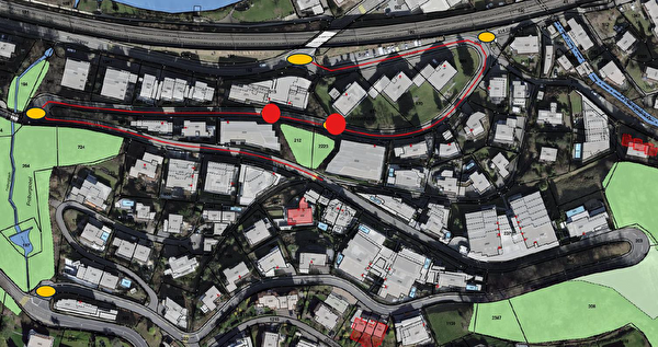 Zwischen den roten Punkten ist die Vollsperrung, an den gelben Punkten steht der Verkehrsdienst.